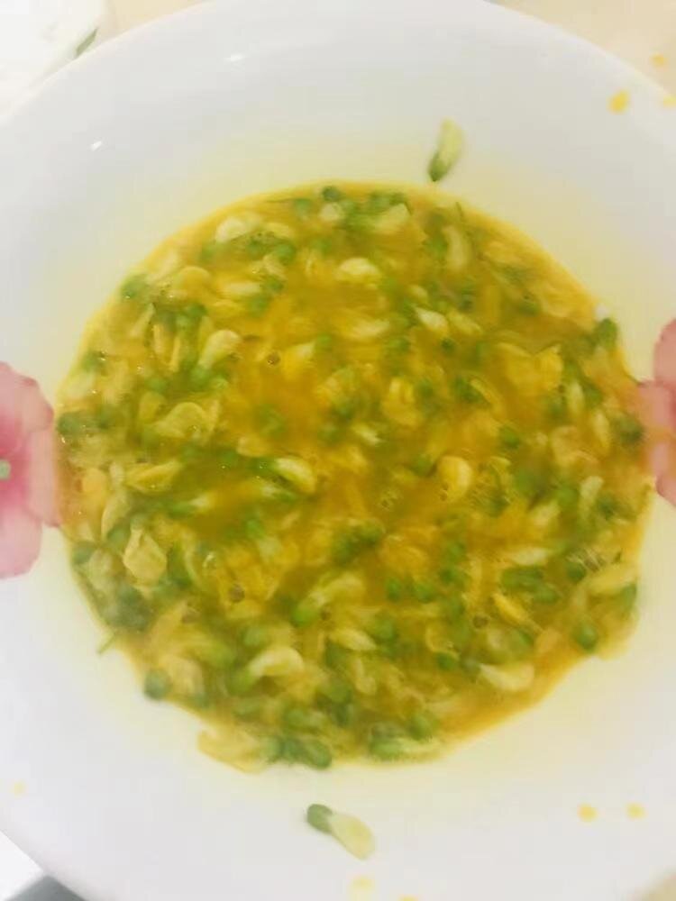 4、磕兩個(gè)雞蛋,加入鹽,蛋和花大概1:1比例,攪散,熱鍋熱油下入蛋液筷子不停攪散,蛋液凝固成熟就盛出就好了